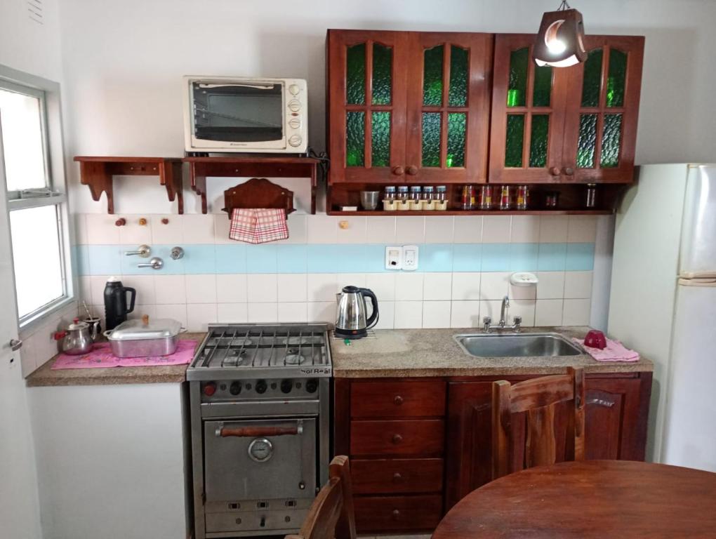 Cocina, Zona de cocina, Nevera, Microondas, Hervidor eléctrico, Horno, Productos de limpieza, Mesa de comedor, Copas de vino
